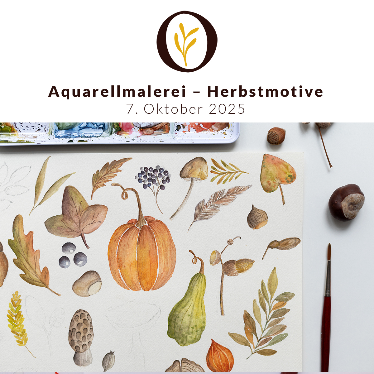 - Weiters erhältst du ein Handout zum Thema Aquarellmalerei – Herbstmotive (vor Ort in gedruckter Form und nach dem Workshop in digitaler Version als PDF per E-Mail), das alle Übungen, Vorlagen und viele Tipps und Tricks enthält.