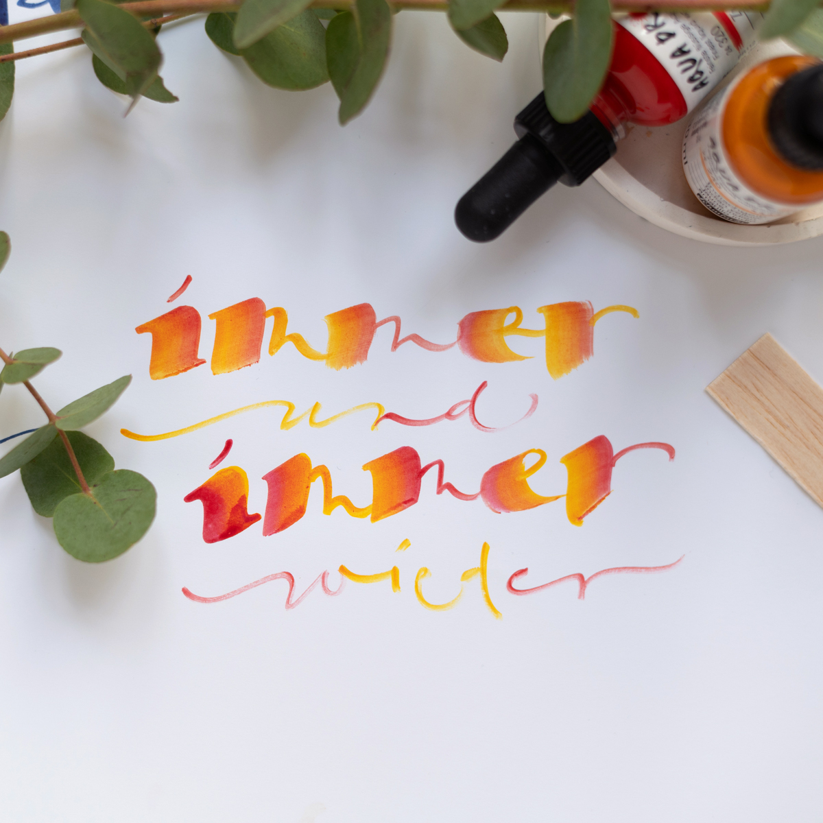 Bei der experimentellen Kalligraphie arbeiten wir, wie der Name schon verrät, experimentell und zum Teil auch abstrakt. Das heißt, wir werden mit vielfältigen Materialien schreiben, die so zum Teil auch gar nicht für die Kalligraphie gemacht sind. Wir werden mit verschiedenen Hölzern, wie Balsaholz, Ästchen und Co., aber auch mit Foam Brushes und anderen außergewöhnlichen Brushes arbeiten und uns anschauen, was mit diesen Werkzeugen alles möglich ist und wie man mit zum Teil auch Alltagsgegenständen überhaupt schreiben kann.