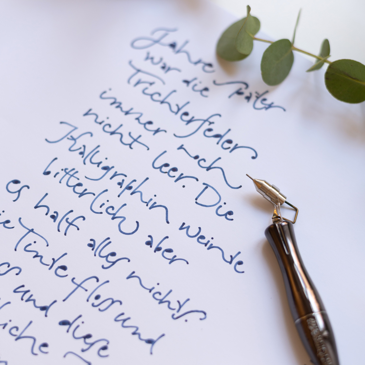 Neben Hölzern und Alltagsgegenständen werden wir auch Trichterfedern und Schreibschablonen nutzen und so unterschiedliche Werkzeuge und Möglichkeiten miteinander kombinieren. Wir möchten dir so den Spaß am Schreiben und der experimentellen Kalligraphie vermitteln und Mut zum Ausprobieren und Experimentieren machen. Dabei werden wir dich natürlich mit all unseren Tipps, Tricks und Ideen versorgen.