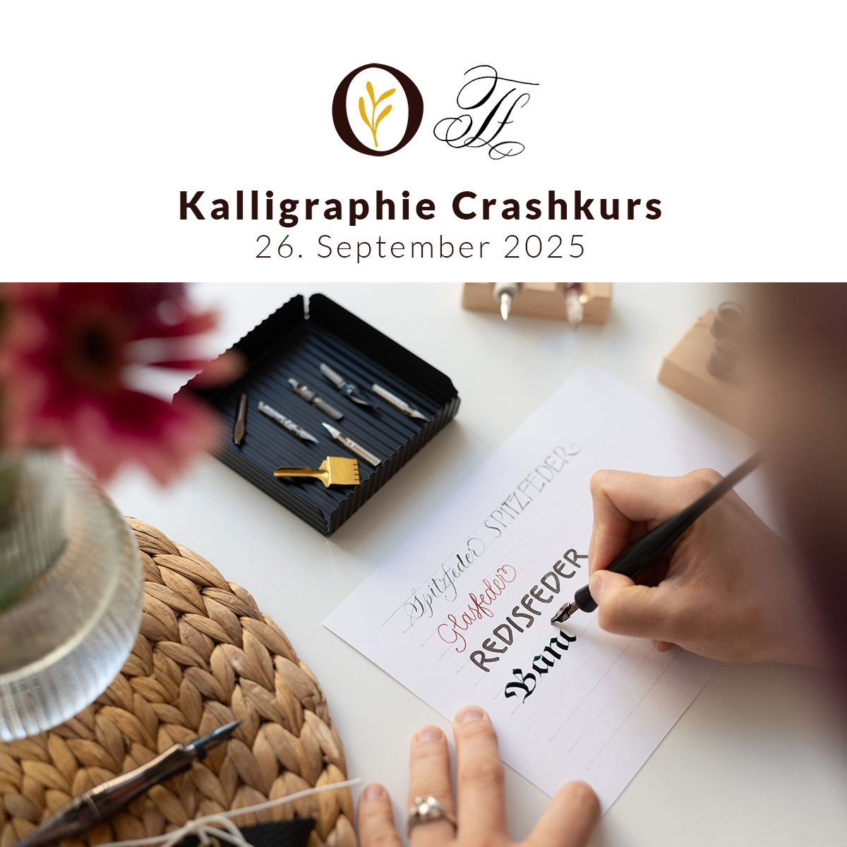 - Weiters erhältst du ein Handout zum Thema (vor Ort in gedruckter Form und nach dem Workshop in digitaler Version als PDF per E-Mail), in dem nochmal alle Kalligraphie-Varianten zusammengefasst sind.